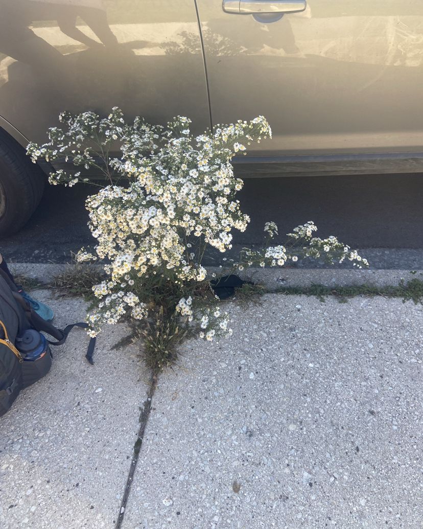 On Saturday, I visited UIC to watch the rugby game. While walking to the game's afterparty, a teammate stopped me so that we could look at these flowers; I think they are daisies or white asters.