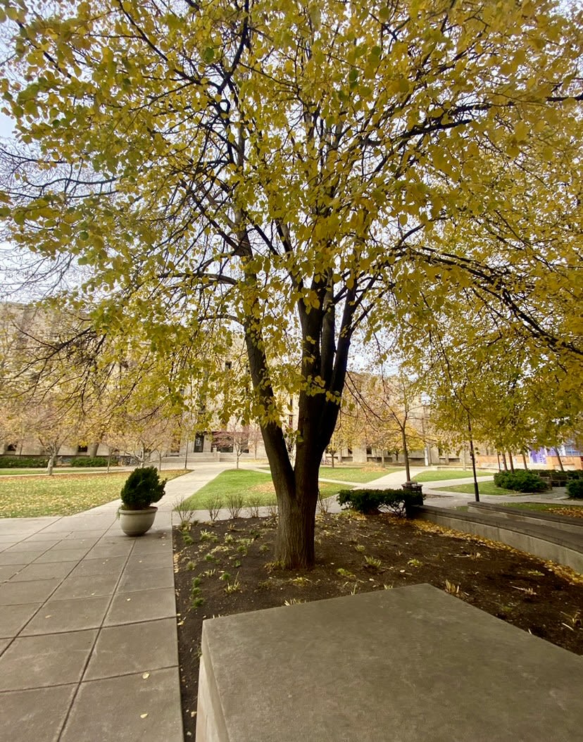 The tree and its surrounding plants are seemingly maintained. Based on its health, I deduce that it receives an adequate degree of exposure to sunlight and rain. Interestingly, Professor Anastasio noted that the Bartlett Quad was originally a parking lot next to the library; as a result, the roots of the tree may be impacted by the fact that the ground used to be concrete.